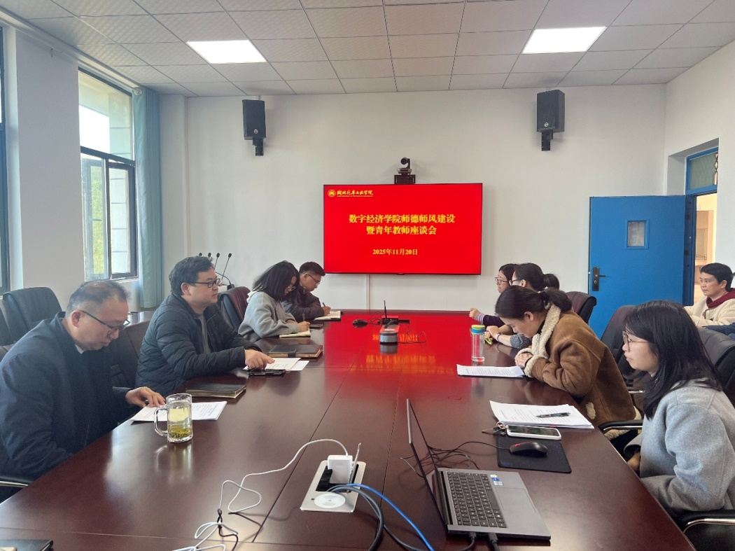 副院长胡政发详细介绍了本次座谈会的背景、目的与意义,强调青年教师是学院发展的中坚力量,搭建交流平台旨在破解成长难题、明晰发展方向。随后,全体参会人员共同学习《数字经济学院青年教师培养办法(试行)》文件精神,明确培养对象为入职未满三年的青年教师,学院将构建 “1+3+N” 一体化培养体系,以立德树人为核心引领,聚焦教学、科研、实践三大能力资助,拓展学生发展、学校服务等多元成长路径,同时突出师德为先的基本要求,明确教学能力提升、科研目标达成、实践经验积累及综合贡献等关键任务,并建立导师制为青年教师成长保驾护航。