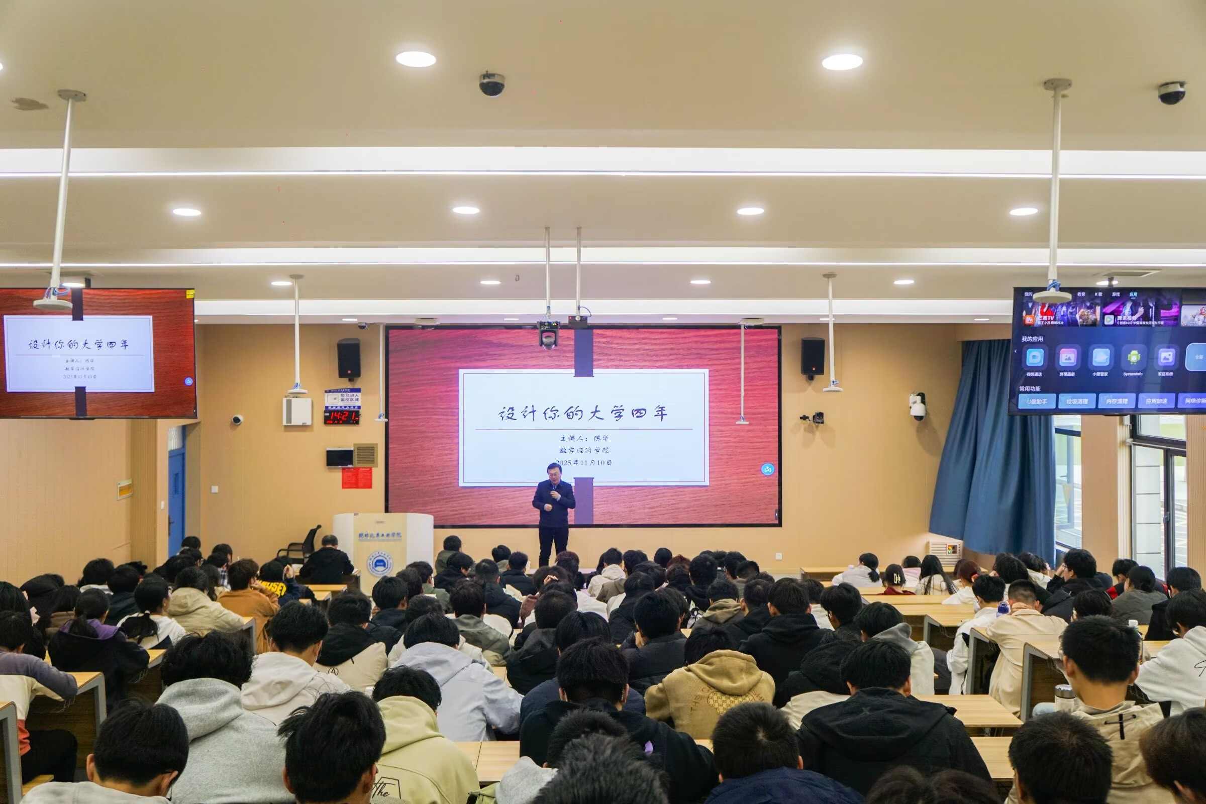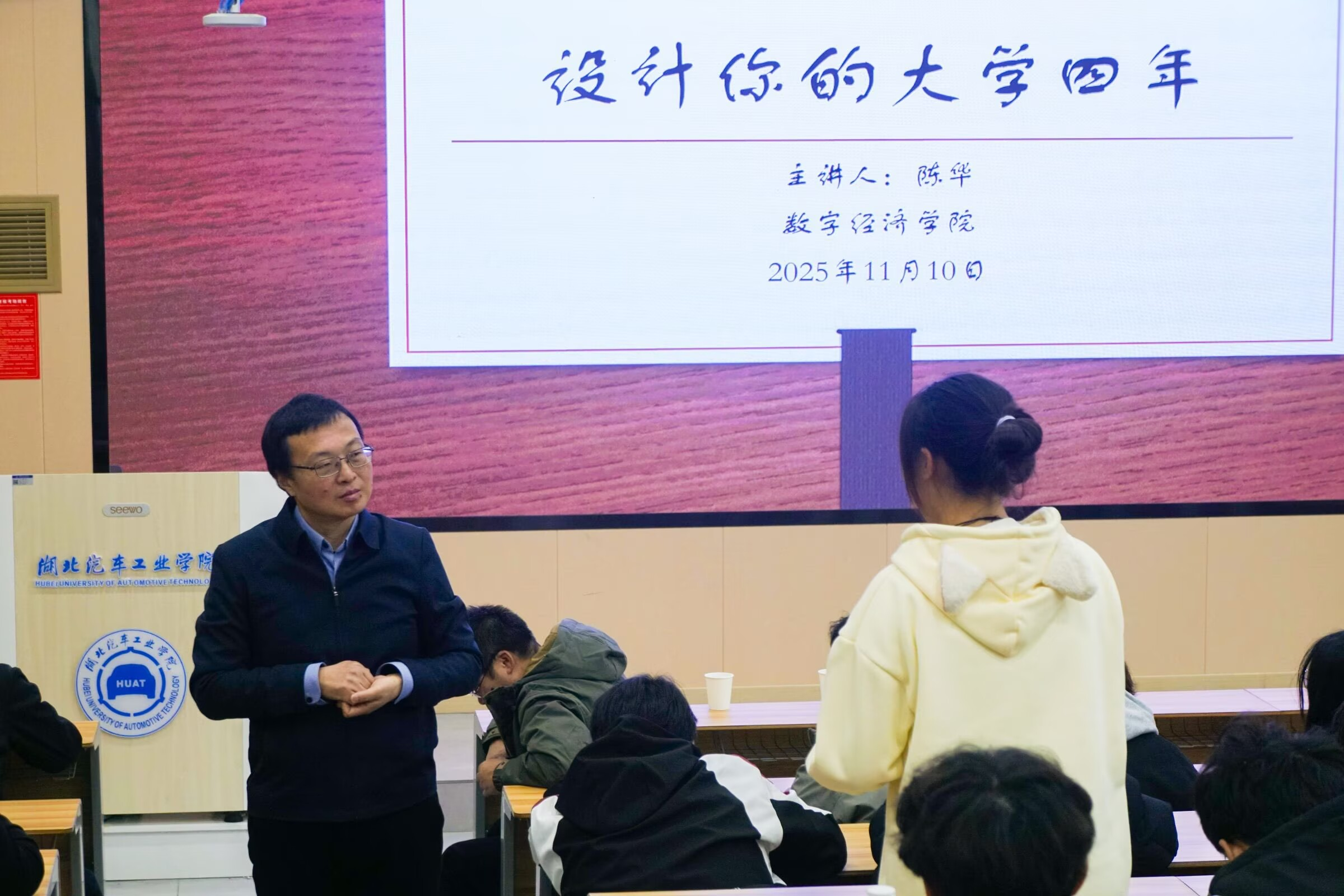 11月10日下午,数字经济学院在第八教学楼8106教室成功举办“设计你的大学四年”职业规划专题讲座。讲座特邀中央财经大学保险学院教授、博士生导师陈华主讲,为学子搭建科学规划学业、明晰职业路径的交流平台。数字经济学院党委副书记余厚德、学工办主任吴文斌以及大一学生代表参加活动。