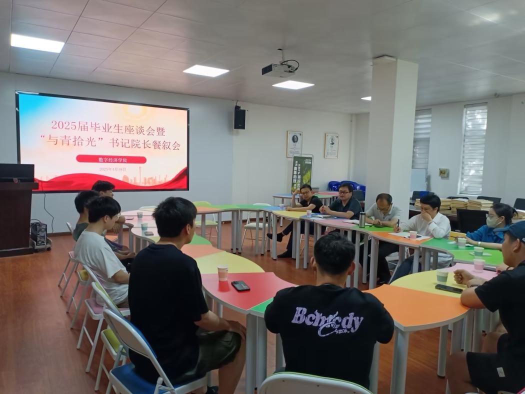 2025年4月18日下午,数字经济学院于心理健康中心团辅室举行2025届毕业生座谈会暨“与青拾光”书记院长餐叙会。数字经济学院党委书记王礼华,学工办主任吴文斌,数学毕业班班主任吴俊老师、大数据毕业班班主任袁遇晴老师、辅导员徐鑫及2025届毕业生代表及共同参与此次活动,深入探讨了毕业生就业现状与职业发展路径,助力毕业学子破局前行。