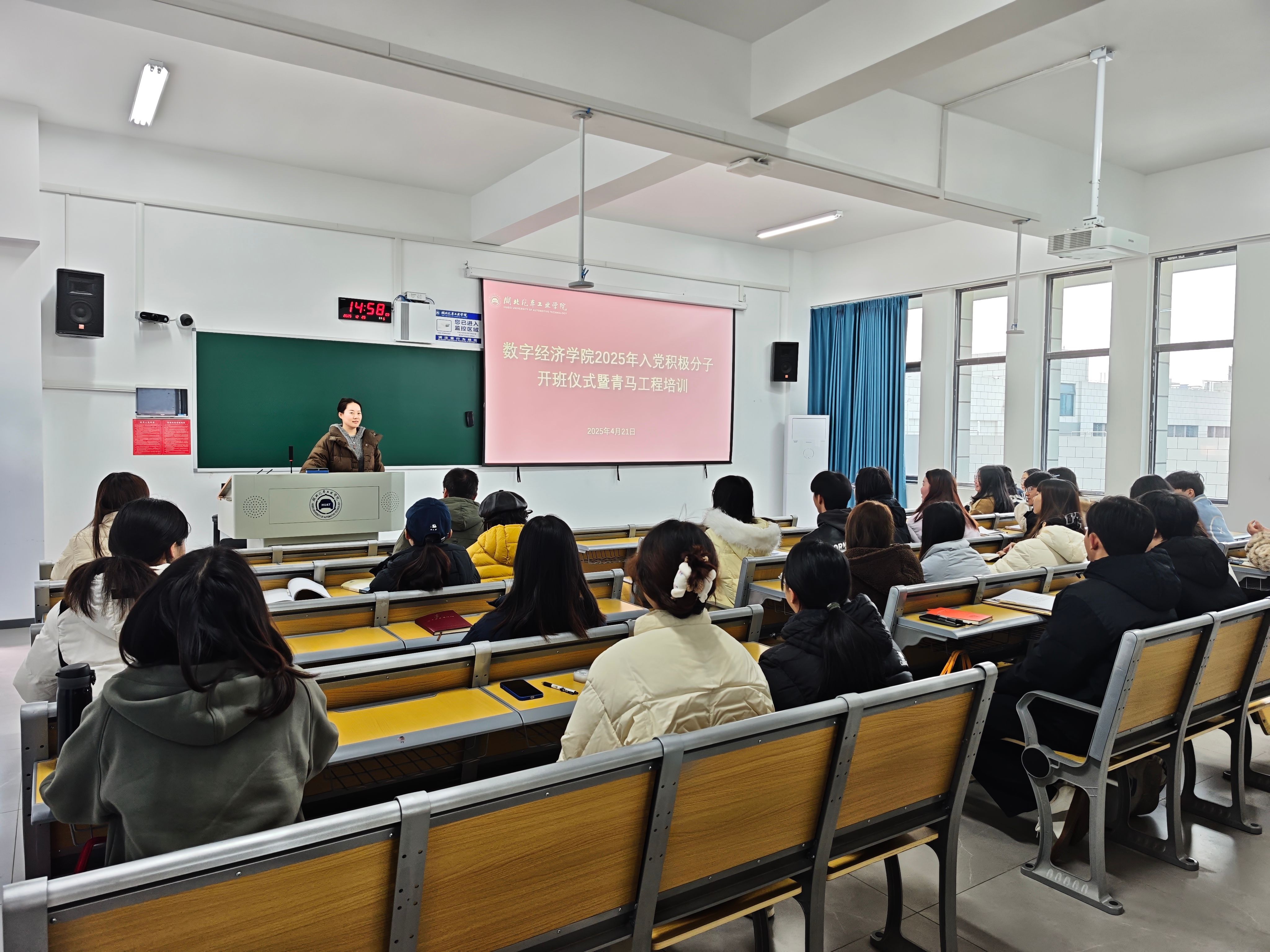 4月21日,数字经济学院2025年入党积极分子培训班开班仪式暨青马工程培训在8501教室举行。湖北汽车工业学院数字经济学院辅导员徐鑫、全体入党积极分子以及青马工程学员参加。会议由团委副书记陈瑜主持。